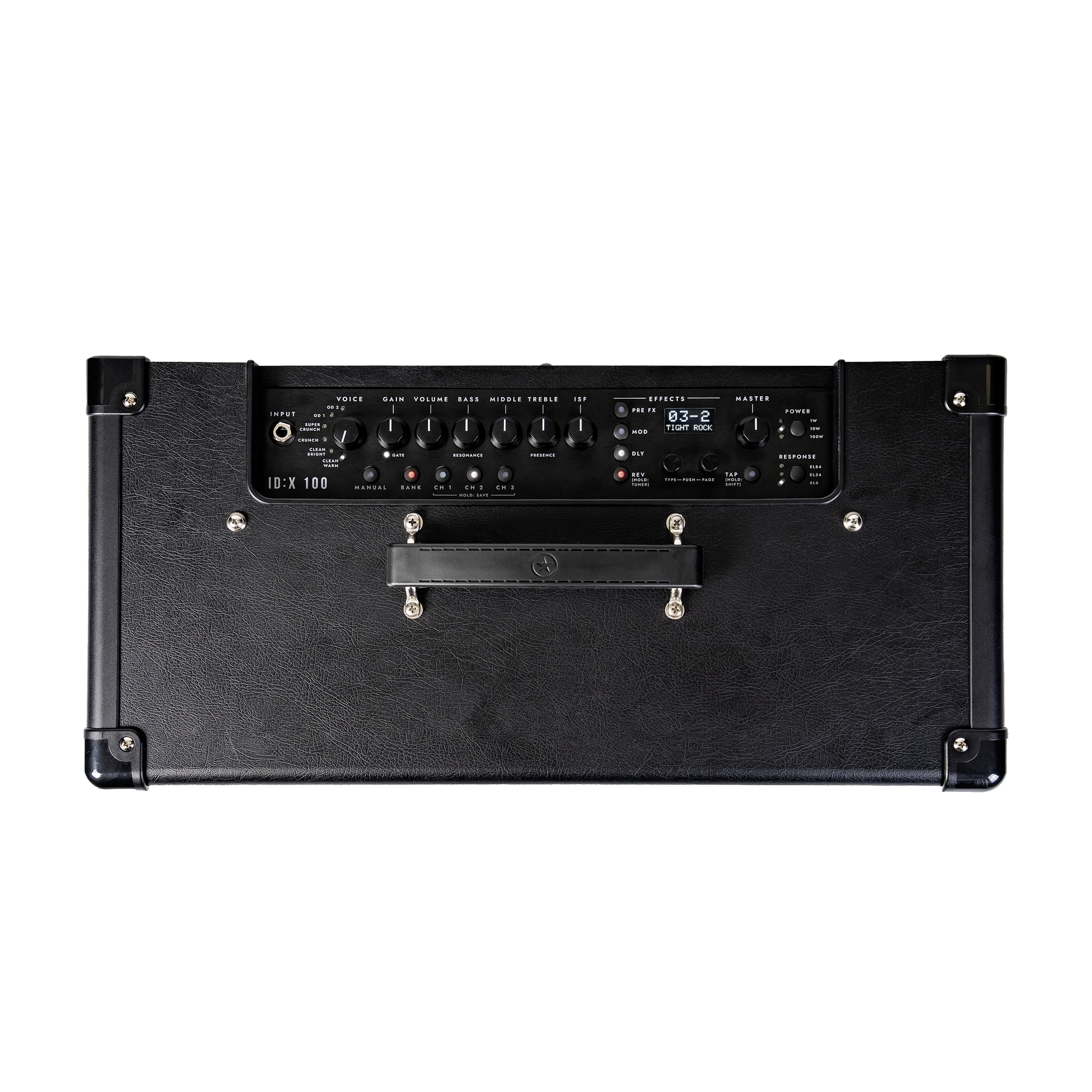 - Schalter: Manual, Bank, CH1-CH3, Pre FX, Mod, Dly, Rev, Tap, Power, Response, Cabrig select