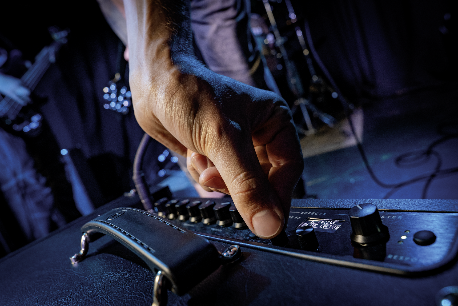 - Schalter: Manual, Bank, CH1-CH3, Pre FX, Mod, Dly, Rev, Tap, Power, Response, Cabrig select